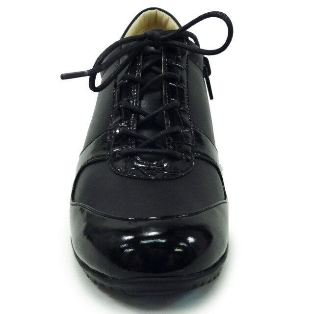 エナメルとクロコの型押しをデザインした、きれいめスニーカー。スカートにも合わせやすいと人気のデザインです。撥水素材なので汚れに強く、ちょっとした雨でも大丈夫。