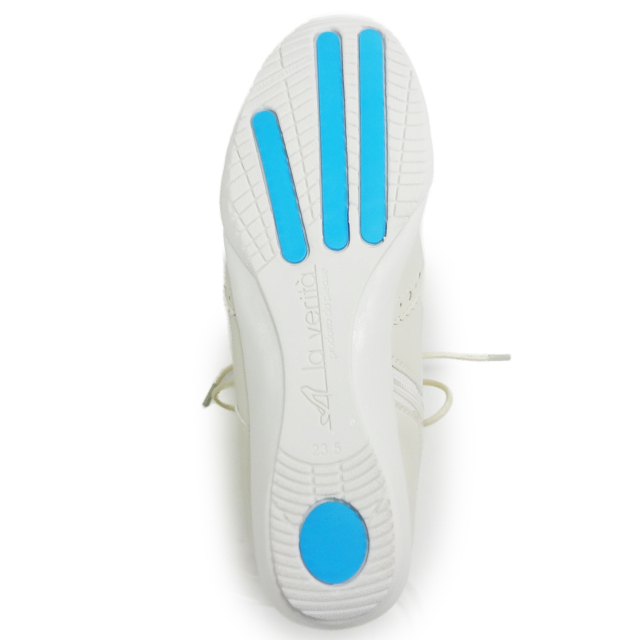 グリップソールの滑りづらい底材を使用。つまさきのアシストブルーバーがつまずきを防止し、ふみきりをサポートします。ヒザや腰に優しい踵下の衝撃吸収パットつき。