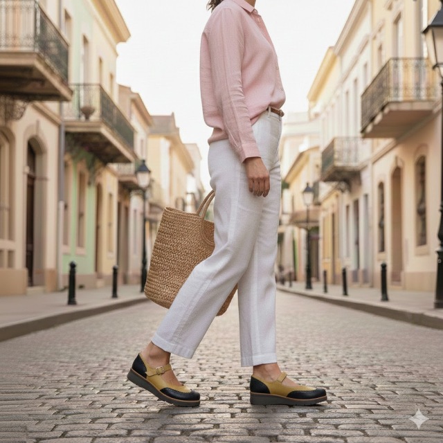 私は踵が浮きやすいので、ベルトでしっかりおさえられるデザインはマストです。 見た目は可愛らしく、甘くなりすぎるかなという印象ですが、 履いてみると意外とスッキリ見えました。 指先にゆとりのある木型、ラウンド型なので、外反母趾気味ですが、圧迫感なく楽に履けました。 サイズは通常の24cmで、靴下で履いても大丈夫でした。